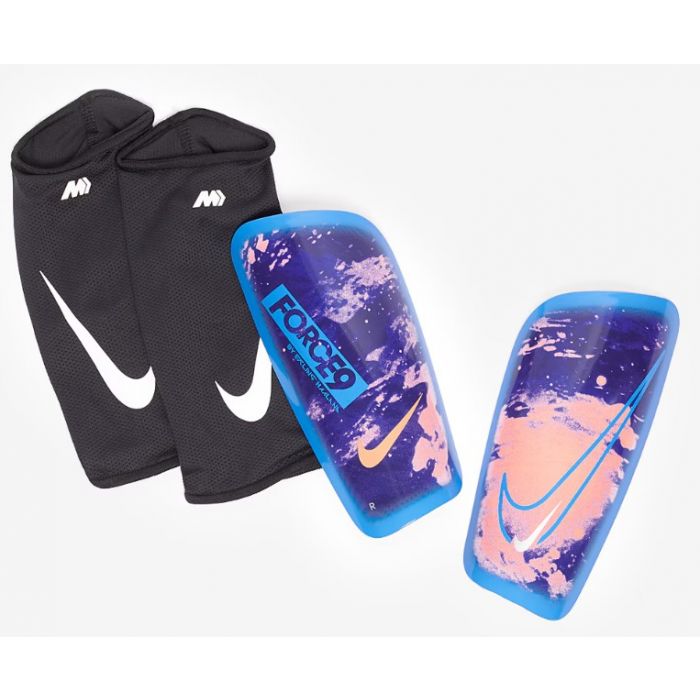 De pads zijn ontworpen voor Mercurial-spelers, dus ze zijn lichtgewicht en laag profiel, met zachte, geperforeerde EVA-demping om schokken te absorberen. Dri-FIT-technologie voert zweet weg van je huid voor snellere verdamping, zodat je droog en comfortabel blijft. De contrasterende kleuren van de opvallende Blue Void, University Blue en Orange Pulse worden gecombineerd met Haaland's persoonlijke branding om je steun te tonen voor een van de grootste voetbalsterren ter wereld.